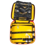 Väskan har 32 stansade hål för ampuller. 4 resårhållare för lite större ampuller. Större ab-behållare kan läggas i den löstagbara väskan.9 elastiska band längst med sidorna av väskan.